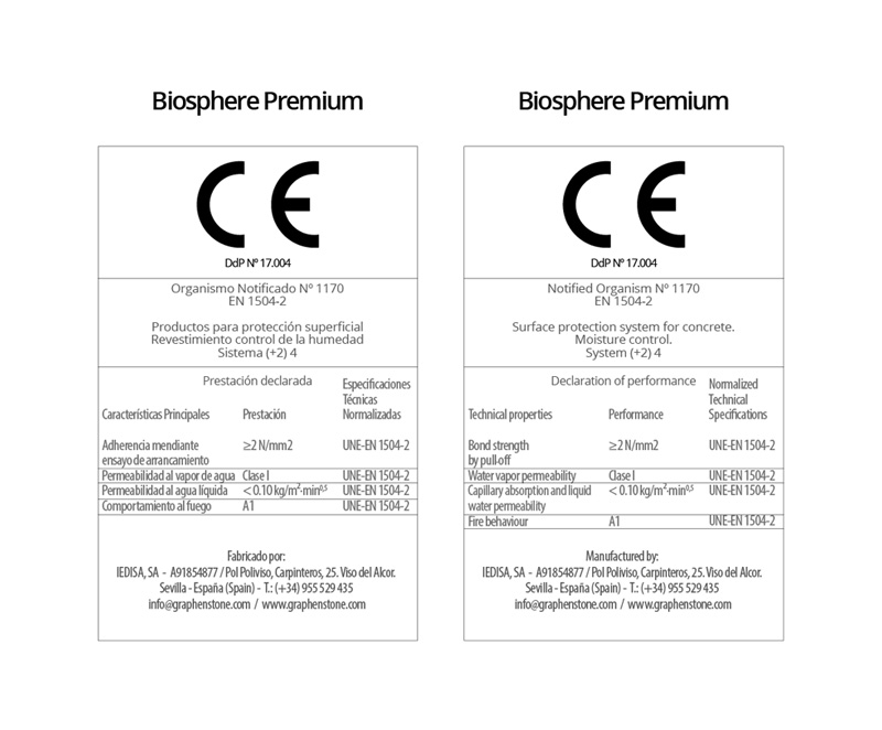 | Award of EC Certificate No. 1170 / CPR / ER.0311 demonstrates the consistency of the Quality Management System implemented for the Biosphere Premium and GrafClean Premium products according to the standard EN 1504-2 for use in humidity control for the surface protection of concrete. This certification ensures the maintenance of the declared performances of products. | |