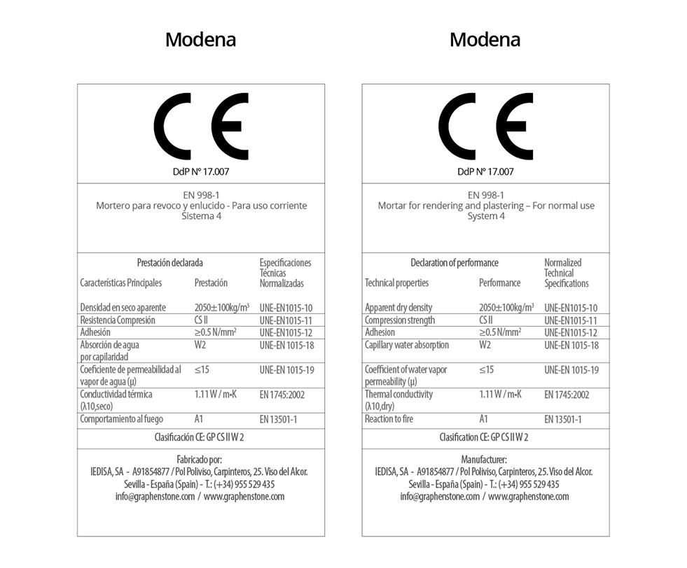 | In accordance with the Regulation (EU) No. 305/2011, a Quality Management System has been implemented in accordance with standard EN 998-1 on the specifications of mortars for rendering and plastering. | ||